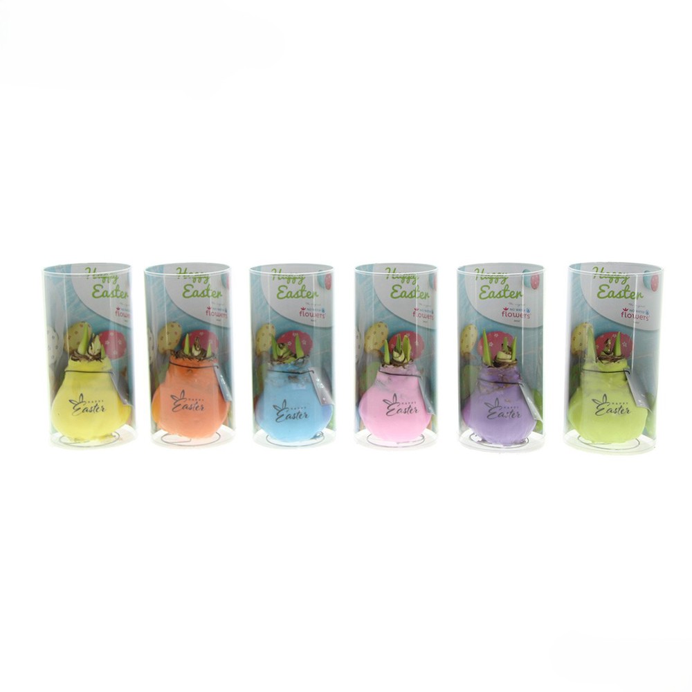 De No Water Flowers® Printz Happy Easter is een vrolijk en kleurrijk paasgeschenk dat perfect past bij een lenteviering of paasmoment op kantoor, en is al voorzien van een feestelijke boodschap. En om het nog specialer te maken, kun je jouw No Water Flowers® paasgeschenk zelfs laten leveren in een Paascilinder, inclusief chocolade-eitjes. De levende No Water Flowers® staan bekend om de unieke handgemaakte wax amaryllisbollen. Deze speciaal geselecteerde en geteste amaryllisbollen hebben genoeg energie om zonder water te groeien en te bloeien. Authentieke No Water Flowers® geven vrij korte bloemstelen, vallen niet om en bloeien gegarandeerd. Iedere No Water Flowers® wordt zorgvuldig schoongemaakt en tot in perfectie gewaxt. Dit geeft de bloembol een eigentijdse en modieuze uitstraling.