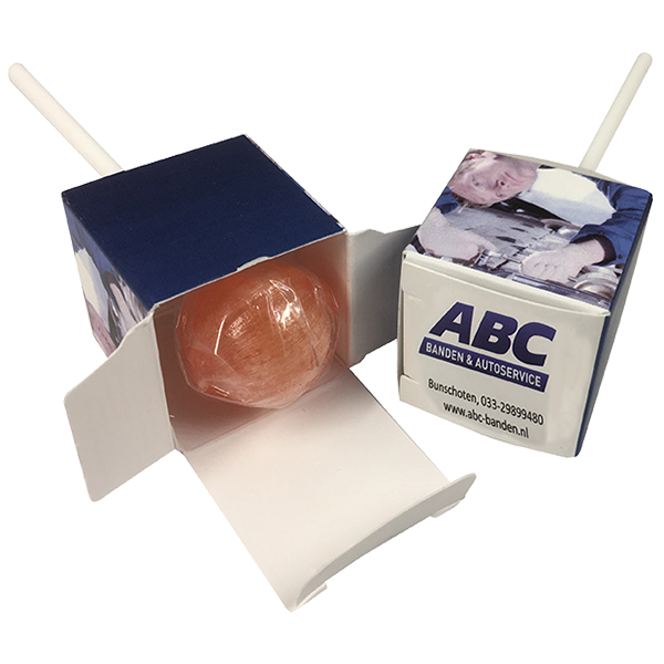 Knotslolly verpakt in een bedrukt doosje. De folie om de knotslolly is transparant en onbedruktmeer