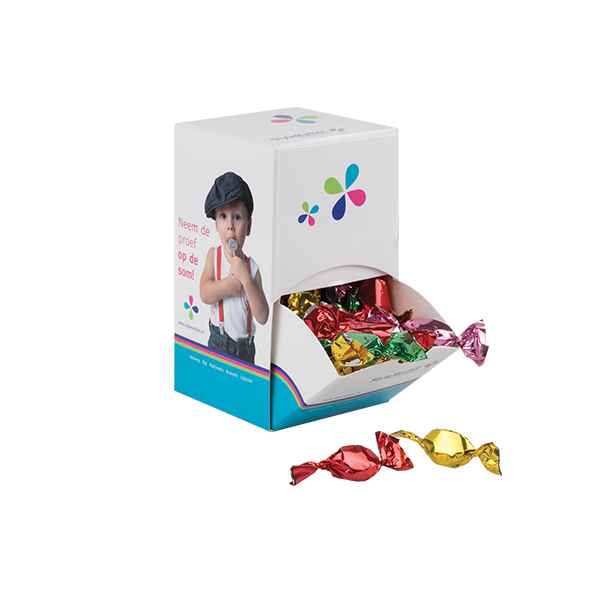 Snoepdoosje met schuifklep als opening. Smaak: Fruit (gekleurde folie) of mint (zilver en blauwe folie)