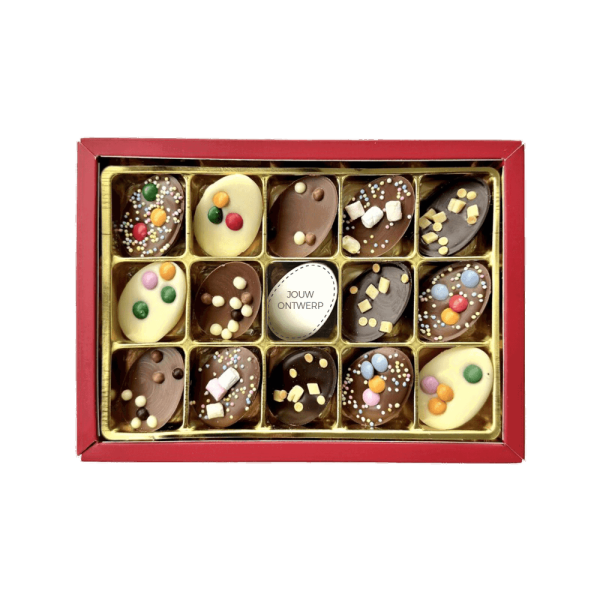 Chocolade versierde paaseitjes | melk/wit/puur | geschenkdoos | eigen logo | 195g