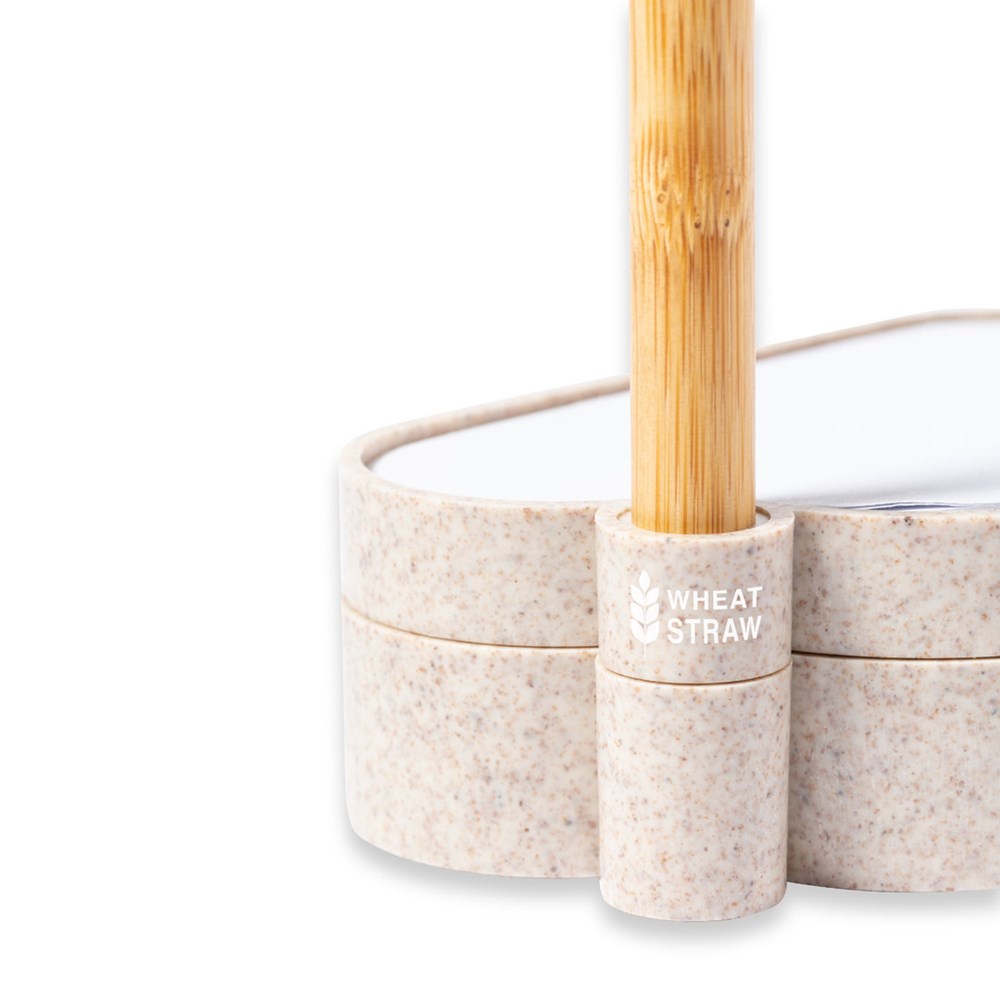 Nature line, zaden notitieblok houder met origineel wolken design. Inbegrepen:Notitieblok met 80 witte notities in de vorm van een wolk.Basis met pennenhouder en twee vakken, inclusief een vel groeipapier. Gemaakt van tarwestro, om het gebruik van natuurlijke grondstoffen te bevorderen en de uitstoot van vervuilende stoffen te verminderen.Balpenaanwijzer met body gemaakt van bamboe dop en details in tarwestro. Met blauwe inkt.Set gepresenteerd in een individuele doos met kraftontwerp, met handleiding in het Engels en Spaans.