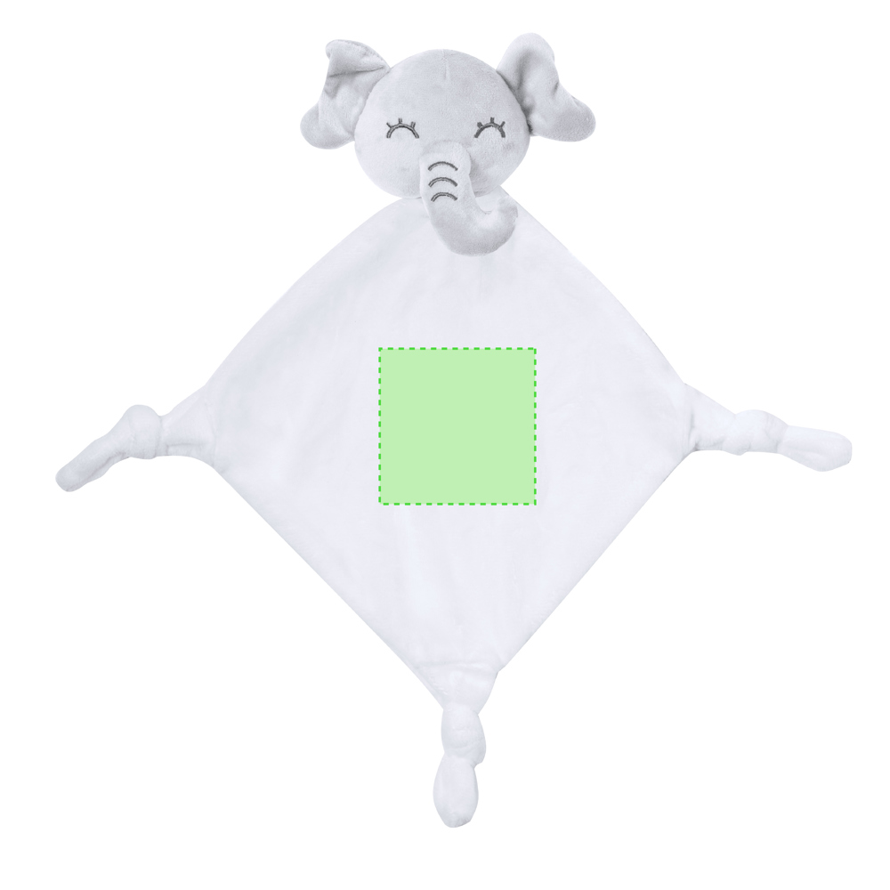 Zachte doudou met schattig wit olifantenmotief. Met knopen in elk van de 3 hoeken om de aanraking van de baby te stimuleren en de ontspanning te bevorderen. Gemaakt uit één stuk stof om te voorkomen dat het in kleinere stukken splijt.