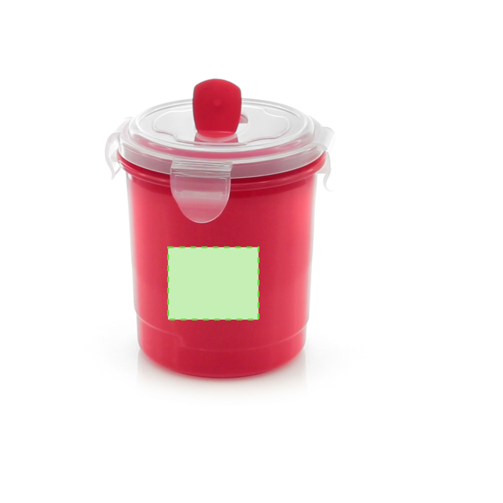 710 ml pot van stevig PP, speciaal ontworpen voor vloeistoffen. In verschillende kleuren, met doorschijnend deksel met 4 sluitingen. Ergonomische handgreep in bijpassende kleur.
